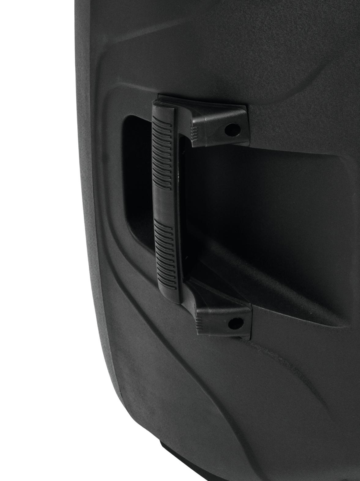 2-полосная колонка с bass-reflex системой. Схема класса A / B: оптимальный звук и мощность при небольшом весе и компактных размерах. Низкочастотный динамик 30 см и ВЧ-динамик 2,5-см. 2 микрофонных входа с отдельными регуляторами уровня. Линейный вход, RCA. Мастер контроль с двухсторонней регулировкой тембра, клипом и индикатором питания. Линейный выход для подключения других активных акустических систем. Прочный пластиковый корпус с защитной решеткой и ручками. Фланец для установки на стойку. 2 колеса для удобной транспортировки. Может использоваться как напольный монитор, стоя, на стойке для АС или настенном держателе. Для мобильных приложений, живой музыки (Live) и DJ. Главный эквалайзер: 1 х 2 полосы управления тоном.