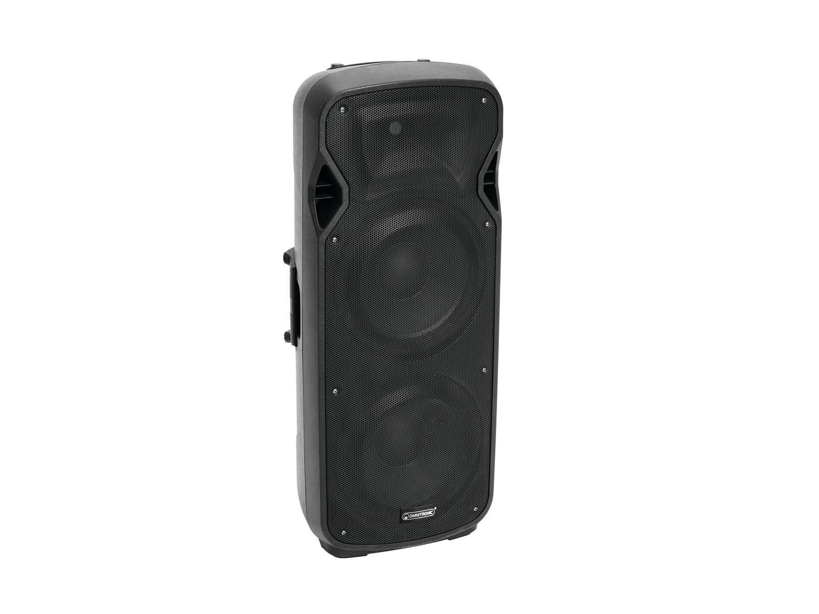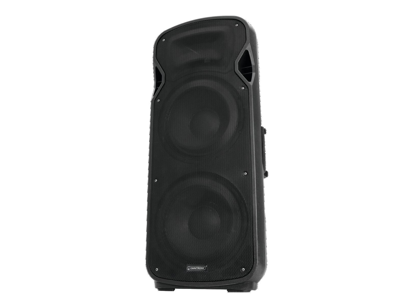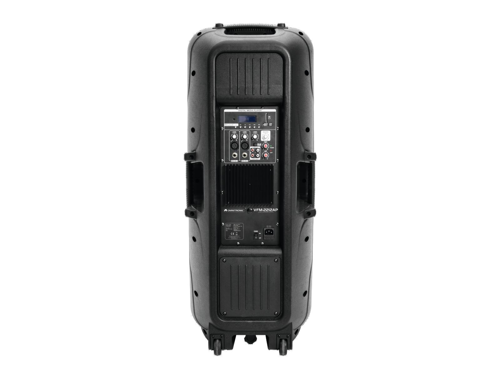 2-полосная колонка с bass-reflex системой. MP3-плеер с Bluetooth-приемником, синим ЖК-дисплеем и ИК-пультом дистанционного управления. Слот для SD-карты и USB-вход. Возможно воспроизведение музыки по беспроводной сети с мобильных устройств (например, смартфона, планшета) через Bluetooth. Схема класса A / B: оптимальный звук и мощность при небольшом весе и компактных размерах. С двумя низкочастотными динамиками по 38 см и 2,5-сантиметровым твитером. 2 микрофонных входа с отдельными регуляторами уровня. Линейный вход, RCA. Мастер контроль с двухсторонней регулировкой тембра, клипом и индикатором питания. Линейный выход для подключения других активных акустических систем. 2 колеса для удобной транспортировки Стабильный пластиковый корпус с защитной решеткой и ручками. Фланец для установки на стойку. Может использоваться как напольный монитор, стоя, на стойке для АС или настенном держателе. Для мобильных приложений, живой музыки (Live) и DJ. Главный эквалайзер: 1 х 2 полосы управления тоном Управление: ИК-пульт дистанционного управления Транспортная помощь: тележка