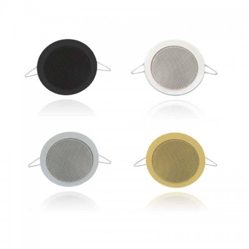 10 см широкополосный динамик (4 "). 100 В трансформатор с 2-х отводами мощности. Простой монтаж, с имитацией стандартных встраиваемых светильников. Для речевого оповещения и фоновой музыки в помещениях. Крышка с металлической решеткой доступна в черном, белом, золотом и серебристом цвете.