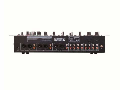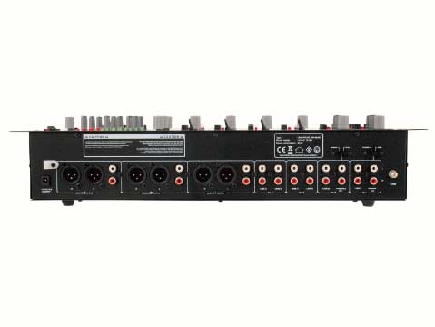 3-х зонное средство маршрутизации всех входных каналов по желанию. 4 входных канала с регуляторами усиления, пиковыми светодиодными индикаторами сигнала и гладкими двух-рельсовыми фейдерами. 2 микрофонных канала с регулятором уровня, 2-полосный эквалайзер, Talkover и кнопка включения / выключения Prefader (Пред-фейдер) прослушивания (CUE) стереофонических входных каналов и выходов на зоны через регулируемый выход на наушники. Выходные зоны с регулятором уровня, 3-полосным эквалайзером и 10-значным светодиодным индикатором уровня. Входы: 6 х линейных (стерео RCA); 2 х линейных / фоно (стерео RCA), отключаемые; 2 х микрофонных (XLR / 6,3 мм jack-разъем) и на наушники (6,3 мм jack-разъем). Выходы: 3 х мастер (опционально 3-контактный XLR или стерео RCA). Подключение с помощью прилагаемого блока питания. Монтаж в РЭК-стойку, 4 U