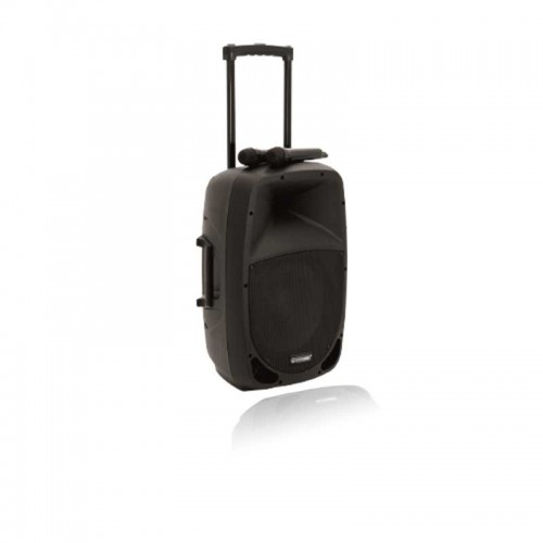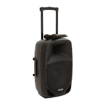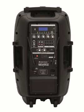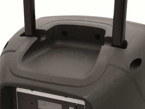 Портативная акустическая система для мобильного использования. Идеально подходит для сети независимых и беспроводных приложений, например для развлекательных и коммерческих мероприятий, лекций и спортивных залов. 3-канальный микшер-усилитель (45 Вт RMS) и 2-х полосная акустическая система с 30 см НЧ-динамиком (12 "). MP3-плеер с приемником Bluetooth, IR-пульт дистанционного управления и регулировкой громкости. Слот для SD-карты и USB-вход. Возможно беспроводное воспроизведение музыки с мобильных устройств, таких как смартфоны, планшеты и ноутбуки через Bluetooth. Встроенный УВЧ ресивер с блоком приемника и 2-мя беспроводными микрофонами. Работа от сети или от аккумулятора до 4-5 часов воспроизведения музыки. Встроенная автоматическая зарядка батареи. Свинцово-кислотный аккумулятор опционально (код 13106993) 2 моно канала для микрофонов. 1 входной линейный стерео канал для источников сигнала например CD-плееры и ноутбуки. Регулируемый эффект реверберации для беспроводных микрофонов / подключаемых микрофонов. Графический 5-полосный эквалайзер, регулятор громкости. 2 мастер-выхода (моно). Клеммы для работы от внешнего источника питания или 12В батареи (например, автомобильного аккумулятора). Эксплуатация ручных микрофонов через 2 батарейки типа АА (не входят в комплект). Легкий черный пластиковый корпус с металлической решеткой, формой монитора. Фланец для установки на стойку для акустических систем. Для мобильности два колеса и выдвижная ручка - типа тележка.