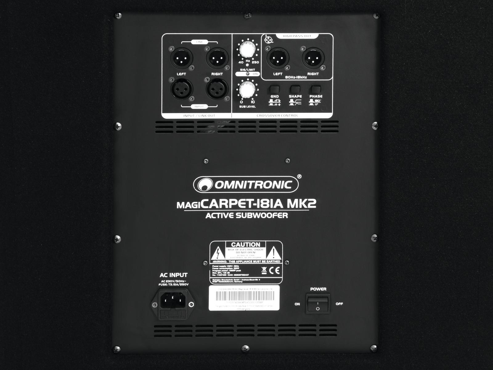 Активный сабвуфер с bass-reflex системой и мощностью 250 Вт RMS. Низкочастотный динамик 45 см (18 ") с звуковой катушкой 100 мм. Регулируемый вход XLR с сквозным выходом. Выход XLR с фильтром верхних частот для активных верхних динамиков. Регулируемая частота кроссовера от 40 до 250 Гц. Усиление низких частот, наземный лифт и контроль фазы. Лимитируемый индикатор мощности и сигнала. Прочный деревянный корпус с черным войлочным покрытием. Металлический фланец для крепления верхних динамиков. Барные ручки для удобной транспортировки. Ударопрочная металлическая решетка, стальные углы и опорные ножки. Для мобильных приложений и стационарных установок. Удобен при транспортировки автомобильным транспортом.