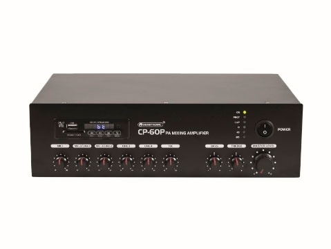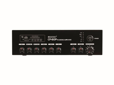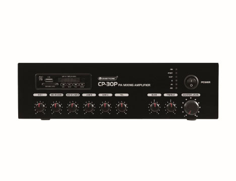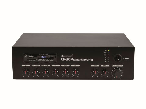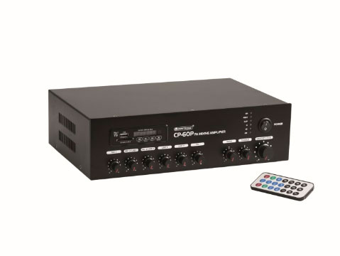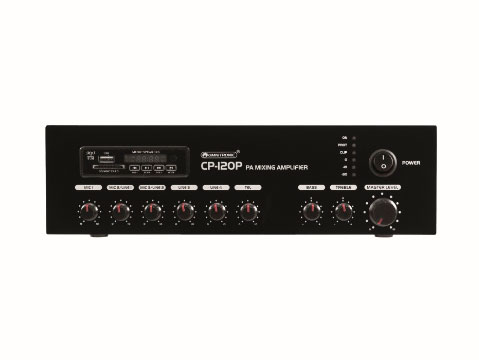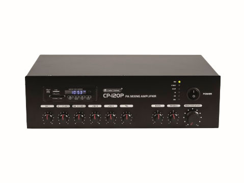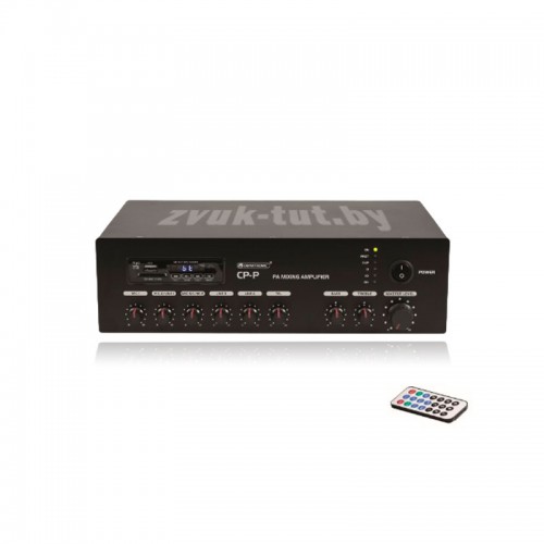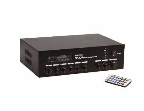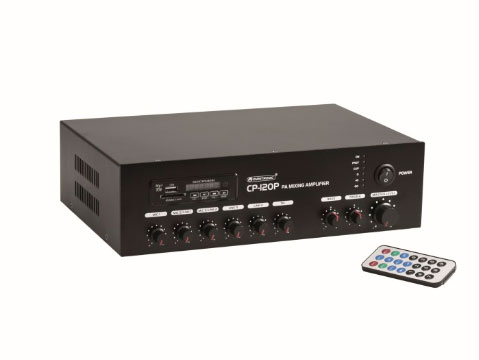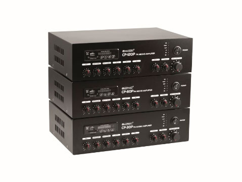 Компактный микшер-усилитель 1 x 30 Вт (CP-30P), 1 x 60 Вт (CP-60P), 1 x 120 Вт (CP-120P). Встроенный аудиоплеер с Bluetooth-приемником и ИК-пультом дистанционного управления. Воспроизведение музыки по беспроводной сети с мобильных устройств (например, смартфон, планшет) через Bluetooth. Слот для SD-карты и USB-вход. FM-тюнер с автосканированием. Mic 1 (XLR) с фантомным питанием и приоритетной схемой. Микрофон 2 и 3 (гнездо) переключаемый микрофон / line. 2 дополнительных входа (RCA) с отдельными регуляторами уровня. 1 телефонный вход с приоритетом и схема MOH (Music on Hold) для телефонных систем с аудиовыходом. 1 линейный выход (RCA). Выходы PA для громкоговорителей 70 В или 100 В. Выходы PA для низкоомных динамиков (4-16 Ом). Высокочастотные и басовые и ведущие элементы управления для выходного сигнала. 4-кратный светодиодный индикатор уровня. Цепи защиты со светодиодной индикацией: перегрузка, короткое замыкание, ограничитель клипа, перегрев. Вентилятор охлаждения. Работа сети и 24 В аварийного питания. Компактная настольная консоль.