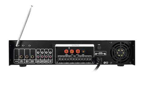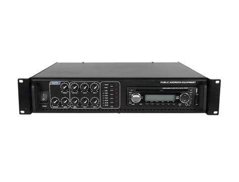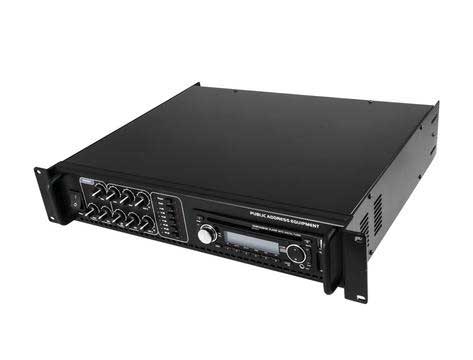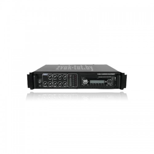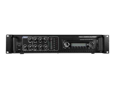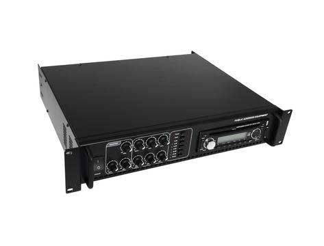 6 выходов на независимые друг от друга зоны PA (100 V), переключаемых на передней панели. Выходная мощность усилителя: 1 х 350 Вт RMS. Мастер - выход (70 В и 100 В). Выход для низкоомных громкоговорителей (4-16 Ом). FM / AM тюнер с 24 местами памяти для запоминания станции. CD / MP3-проигрыватель. Доступные аудио диски: CD- DAs, CD-R, CD-RW. Слот для SD-карты и USB-вход. Передний вход AUX (jack-разъем 3,5 мм) Формат воспроизведения: WAV, WMA, MP3 (CBR и VBR файлы). Синяя подсветка ЖК-дисплея с индикацией ID3-тега (песня, исполнитель, альбом). Функция Loudness. Папка навигации. Удобный выбор дорожки с кнопкой +10 и -10. Функции повтора: воспроизведение в случайном порядке, сканирование. 3 микрофонных входа (6,3 мм jack-разъем, UNBAL.) С отдельными регуляторами уровня. Вход 1 с регулируемой приоритетной схемой. 3 линейных входа (стерео RCA) с отдельными регуляторами уровня. 1 линейный выход (стерео RCA). 2-полосный регулятор тембра (высокие частоты, бас). 7-кратный светодиодный дисплей уровня. Схемы защиты со светодиодной индикацией: от перегрузки по току, короткого замыкания, задержки включения. Монтаж в РЭК-стойку.