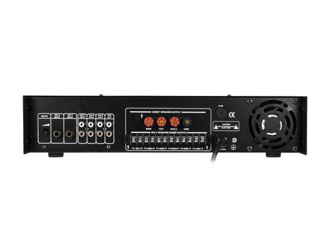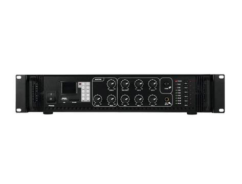 Удобное управление громкоговорителями с помощью технологии 6-ти зон. 6 выходов для каждой зоны независимо переключаются на передней панели. Мастер - выход (70 В и 100 В). Выход для низкоомных громкоговорителей (4-16 Ом). MP3-плеер с пультом дистанционного управления и ЖК-дисплеем с голубой подсветкой. Слот для карты SD и USB-вход. Навигация по папкам и функция повтора (1, всё). 2 микрофонных входа на задней панели (6.3 мм разъем jack, unbal.). 1 вход для микрофона на передней панели (сочетание XLR/6.3 мм разъем jack, unbal.) с приоритетной регулировкой. Все микрофонные входы с раздельными регуляторами уровня. 3 линейных входа (стерео RCA) с отдельными регуляторами уровня. 1 линейный выход (стерео RCA). Перезвон, отключаемый. Регулировка ВЧ и НЧ для выходного сигнала. 7-кратный светодиодный индикатор уровня. Мастер - контроль для управления выходного сигнала. Вентилятор охлаждения. Электрическая защита со светодиодной индикацией: перегрузка по току, короткое замыкание, задержка включения. Монтаж в РЭК-стойку, кронштейны съемные.