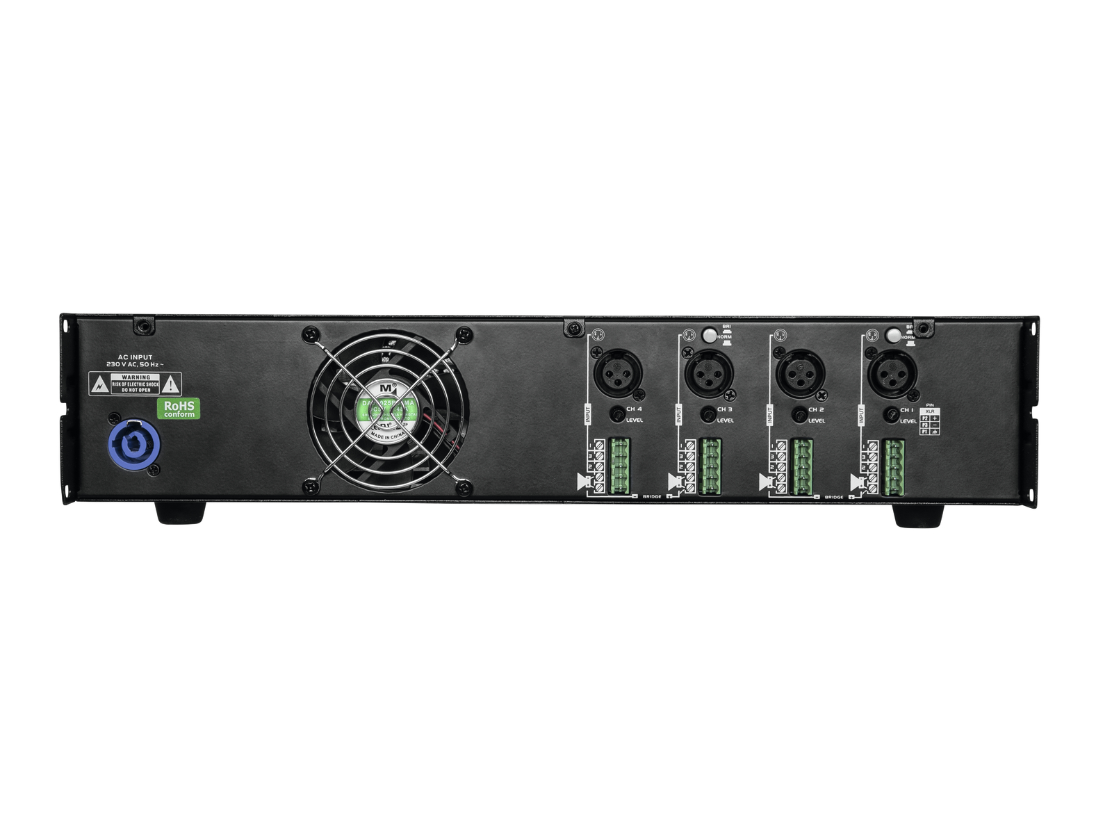 Усилитель PA со встроенным ограничителем для многозонных приложений. 4 зоны по 500 Вт / 4 Ом или по 250 Вт / 8 Ом. Возможна 8-омная работа через мост. Сигнальные входы через сбалансированные XLR-гнезда или клеммные колодки. Подключение динамиков через клеммные колодки. Защита от несанкционированного доступа на задней панели. 3-кратный светодиодный индикатор уровня выходного сигнала на каждый канал. Задержка включения динамика. Вентилятор охлаждения. Прочный стальной корпус с алюминиевой передней панелью. Полная защита от короткого замыкания, перегрева, перегрузки и наложения напряжения постоянного тока на выходах. Установка в стойку с 3 U.