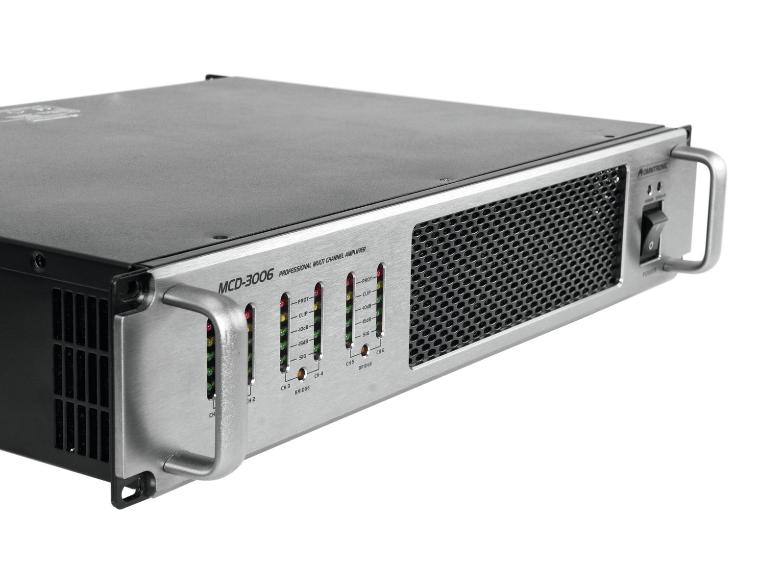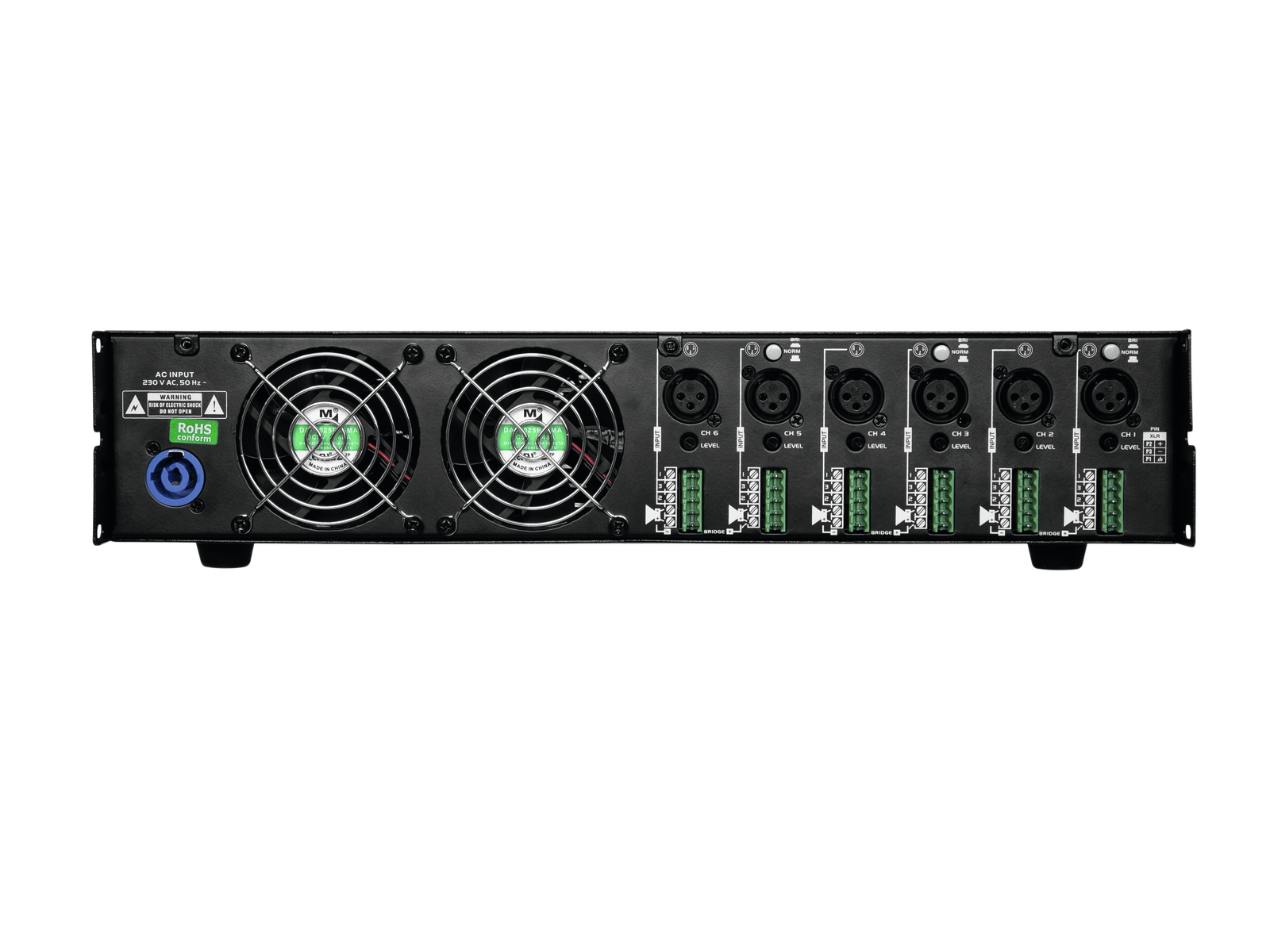 Усилитель PA со встроенным ограничителем для многозонных приложений. 6 каналов по 500 Вт / 4 Ом или по 250 Вт / 8 Ом Возможна 8-омная работа через мост. Сигнальные входы через симметричные XLR-гнезда или клеммные колодки. Подключение динамиков через клеммные колодки. Защита от несанкционированного доступа на задней панели. 3-кратный светодиодный индикатор уровня выходного сигнала на каждый канал. Задержка включения динамика Вентилятор охлаждения Прочное стальное шасси с алюминиевой передней панелью. Полная защита от короткого замыкания, перегрева, перегрузки и наложения напряжения постоянного тока на выходах. Установка в стойку с 3 U.